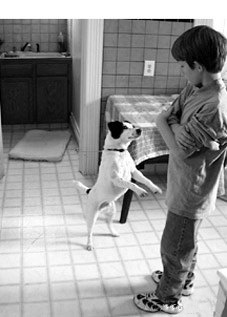 最重要是教导它当见到主人时不要跳起来,并让它明白双手在地板上才能得到主人的欢喜。虽然语言不能让它明白,但是你可以用行动说明。当它与你打招呼时,它的目的是引起你的注意和让你抚摸它。知道这一点后,你就要做以下的2件事情: